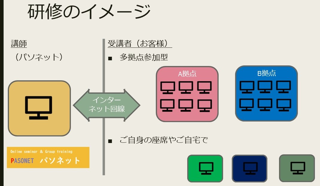 受講する方が様々な場所(部署)から接続していただいて大丈夫です。